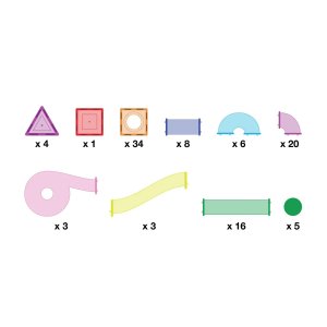 Obsahuje barevné průhledné magnetické dlaždice, rampy a trubice.Umožňuje stavbu 3D kuličkových drah. Děti mohou vytvářet vlastní závodní tratě a sledovat, jak kuličky projíždějí zatáčkami a pády. Učení skrze hru zahrnuje pohyb, gravitaci a princip příčina–následek (STEM dovednosti).