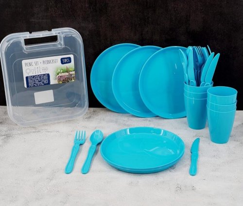 Praktická sada plastového nádobí pro pikniky a venkovní stolování. Vše uloženo v kompaktní úložné krabičce s klipem pro snadné přenášení.