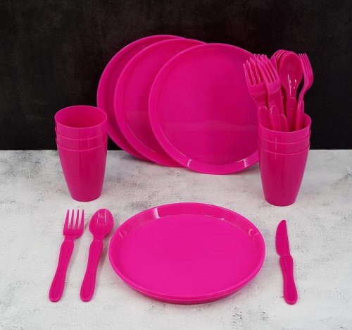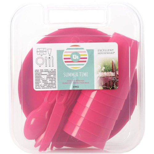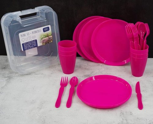 Praktická sada plastového nádobí pro pikniky a venkovní stolování. Vše uloženo v kompaktní úložné krabičce s klipem pro snadné přenášení.