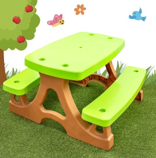 Piknikový stolek se dvěmi lavicemi z kvalitního plastu žluto-fialový.