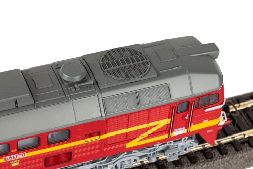 Hledáte něco speciálního pro vaši sbírku modelových vlaků? Zúžte své hledání a podívejte se na novinku roku 2023 - Dieselovou lokomotivu T679.1 "Sergej" CSD IV - 52930 DC! Tento model je detailní replikou legendární T679.1 ČSD v éře IV. TIštěná varianta V 200, s precizním provedením všech důležitých detailů a nejjemnějším lakem a tiskem, vás okouzlí na první pohled. Lokomotivu T679.1 charakterizuje její dokonalá detailnost. Připojené drapáky, ostře gravírované kryty podvozků a vybavení strojovny jsou tak autentické, že vás přenesou rovnou na nástupiště. Standardní osvětlení kabiny strojvedoucího a strojovny, které lze digitálně přepínat pomocí dekodéru PluX22, a zadní světla, která fungují v závislosti na směru jízdy, dodají vašemu modelovému světu realistický dotek. Představte si, jak tato dokonalá replika zavibruje na kolejích vaší modelové železnice. Výkonný pětipólový motor se dvěma setrvačníky zajišťuje skvělé jízdní vlastnosti, a díky digitálnímu rozhraní PluX22 podle NEM 658 je připravena pro snadné dovybavení zvukem a co největším reproduktorem. Tento detailně propracovaný model je skvělým doplňkem pro jakoukoli sbírku, ať už jste vášnivý sběratel nebo začátečník. Nenechte si ujít tuto šanci přidat k vaší sbírce tento klenot modelové železnice. S tímto modelem si můžete užívat hodiny zábavy a potěšení z detailů, které vám umožní prozkoumávat svět vlaků z nové perspektivy. A nezapomeňte, brzdové hadice pro dodatečnou montáž jsou součástí dodávky. Hlavní vlastnosti: registrační číslo OEEZ: DE 24216800napájení DCanalogové ovládáníepocha IVdigitální rozhraní - NEM 658 PluX22zvuk - dekodér lze dovybavitpočet trakčních pneumatik - 2spojka - hřídel NEM + těsný spojkový článeksvětlo - ANO bílá/červená, dle směru jízdyinteriérové osvětlení v kabině digitálně přepínatelné s dekodérem PluX22vhodné od 14+ Dokumenty: Brožura H0 M62Knížka vozidla PIKO H0 V200DR Knížka vozidla PIKO H0 V200 DR ENNávod k obsluze/seznam náhradních dílů 52930