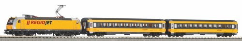 Představujeme vám novinku 2023 Piko Digitální Sada SmartControl WLAN s podložím CZ Osobní vlak Regiojet VI - 59019, digitální soupravu vhodnou pro začátečníky i profesionály modelové železnice. Ve vlakové soupravě je lokomotiva Traxx s dekodérem PIKO a dva osobní vozy RegioJet. Podloží má bezproblémovou montáž i demnotáž na podlaze, nebo na koberci. Její kvalitní provedení slibuje vynikající dráhu, která vydrží. RegioJet a.s. je provozovatel autobusové a osobní železniční dopravy v Česku. Stoprocentní vlastník této společnosti je Student Agency, která na některých nabídkách spolupracovala s německou pobočkou francouzské firmy Keolis. Příležitostnou veřejnou železniční osobní dopravu společnost poprvé prováděla 24. dubna 2010, provoz první linky pravidelné osobní dopravy byl spuštěn 26. září 2011. Sesterská společnost stejného názvu provozuje osobní železniční a autobusovou dopravu (tu od února 2015) na Slovensku. Vozy vznikly jako konkurence dopravy proti Pendolinu Českých drah. Záměrem bylo, aby byla doprava levnější, ale zároveň luxusnější. Specifikace: digitální sadaplocha základny: cca 158 x 88 cmminimální plocha konstrukce: cca 168 x 98 cmtrať s podložímRegiojet elektrická lokomotiva BR 386 1x osobní vozy Regiojet 2x 55412 oblouk R2 s podložím 422 mm 12x 55401 rovné koleje s podložím 231 mm 5x 55406 rovná kolejnice pro spojovací klip 1x 55447 základna pro spojovací klip 1x 55275 spojovací klip 1x propojovací kabel kolejnice 1x PIKO SmartControl WLAN základní sada 1x 55449 PIKO H0 převodník 1x návod k obsluze 1x Hlavní vlastnosti: registrastrační číslo OEEZ: DE24216800napájení DCdigitální ovládáníepocha VIměřítko H0délka vlakové soupravy 745 mmminimální poloměr 358světlo - ANO (měnící se v závislosti směru jízdy)vhodné od 14 let