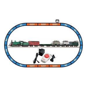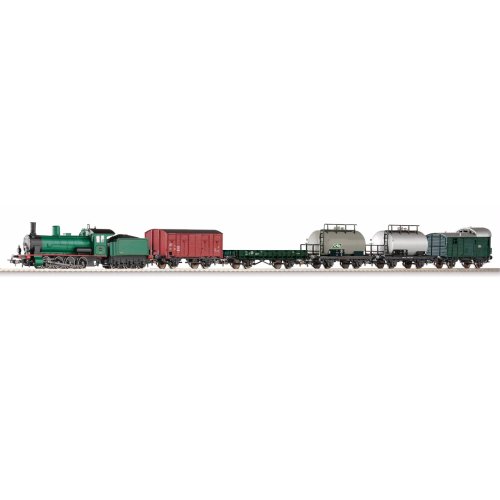 Startovací sada skládající se z parní lokomotivy 0‑8‑0 Rh 71 (G 7.1), pěti nákladních vozů, prodlouženého oválu a analogového ovládání s napájením. Lokomotivu lze dovybavit digitálním dekodérem, návazně také zvlášť určeným zvukovým modulem s reproduktorem, nebo i výrobníkem kouře. Koleje s podložím zajišťují vyšší odolnost a životnost při opakovaném rozebírání. Nákup sady je vhodné doplnit o příslušný spotřební materiál. Plocha základny: 158x88 cmMinimální konstrukční plocha: 168x98 cm Hlavní vlastnosti: analogové ovládánínapájení DCčtveřice náprav (lokomotiva)třínápravový tendrdvojice náprav (vagóny)světla bílé barvy s přepínáním dle směru jízdyrozhraní NEM 652šachta dle NEM 362 s kinematikou krátkého spřáhlakoleje s podložím Tato sada obsahuje: parní lokomotiva Rh 71 (G 7.1) SNCB III (1 ks)různé nákladní vozy SNCB III (5 ks)kolej oblouková R2 s podložím - 55412 (12 ks)kolej rovná G231 s podložím - 55401 (5 ks)kolej rovná G231 s podložím (přípoj pro napájecí svorku) - 55406 (1 ks)podloží pro napájecí svorku - 55447 (1 ks)napájecí svorka ke kolejím analogová - 55270 (1 ks)základní analogový ovladač s napájecím zdrojem - 55003 (1 ks) Dokumentace: ilustrační návod k obsluze a seznam náhradních dílů příbuzné soupravy č. 57123 (DE, EN, FR, NL, IT, ES, PL, RU, CN, CZ)ilustrační návod k obsluze a seznam náhradních dílů příbuzného modelu lokomotivy č. 57550 (DE, EN, FR, NL, IT, ES, PL, RU, CN, CZ)
