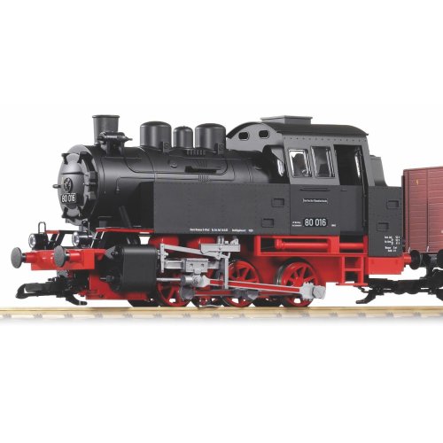 Video je pouze ilustrační, zobrazuje příbuzný produkt. Co je malé, to je hezké, ale co je větší, to je lepší. A když vlak, tak gigantický! Modely měřítka G od firmy PIKO představují mimořádně hodnotné hračky, které přivádějí v úžas fanoušky techniky napříč generacemi. Vydejte se na fantastickou jízdu těmi nejmohutnějšími stroji, omráčí Vás silou motorů a váhou poctivé porce masivního kovu. Podnikněte cestu ke kořenům modelové železnice a odhalte působivý odkaz hračkářů staré školy! Vláčky tohoto měřítka nejsou jen velké, ale také nebývale robustní. Jsou navrženy a zhotoveny tak, aby vydržely hrubší zacházení a umožňovaly provozovat trať na zahradě i za nepříznivého počasí. Otevírají se tak široké možnosti nevídaným zážitkům, vypravte vlak na cestu zasněženou krajinou! Nemusíte se přitom bát složitého sestavování a zapojování. Kolejnice a vagónky lze snadno spojit nebo uklidit. Přehledně značené ovládací i napájecí prvky jednoduše připojíte bez použití jakéhokoliv nářadí. Vysoké životnosti dopomáhají kuličková ložiska, chromované díly, vysoce kvalitní, barevně stálé plasty a spolehlivé krytí motorů i zařízení obsluhy. Modely jsou vyráběny v souladu s nejpřísnějšími evropskými standardy a předpisy, v domovské továrně firmy PIKO, v německém Sonnebergu. ∗★∗ Ukázka zvuku zabudovaného zvukového modulu. Startovací sada soupravy nákladního vlaku skládající se z parní lokomotivy BR 80 a dvou nákladních vozů, krytého a otevřeného, v provedení DB. Lokomotiva má chromovaná dvojkolí a je vybavena kuličkovými ložisky. Disponuje osvětlením měnícím se v závislosti na směru jízdy, analogově ovládaným zvukem a spínatelným výrobníkem kouře. Zvuk je ovládán dvojicí traťových spínacích magnetů, které jsou součástí balení. Sada také zahrnuje hůlku k rozpojení spřáhel, sloužící k odpojování a připojování vozů. Sady PIKO G jsou vhodné do interiéru i exteriéru a právem jsou označovány za „odolné povětrnostním vlivům“. Vyrobeno v Německu, v souladu s nejpřísnějšími standardy kvality. Nákup sady je vhodné doplnit o příslušný spotřební materiál. Plocha základny: 130x130 cmMinimální konstrukční plocha: 150x150 cm Hlavní vlastnosti: trojice náprav (lokomotiva)zvukový modulvýrobník kouřesvětla bílé barvy s přepínáním dle směru jízdydvojice náprav (vagony)otevírací dveře (krytý vůz)vhodné i do exteriéruvyrobeno v Německu Tato sada obsahuje: parní lokomotiva BR 80 DB III se zvukovým modulem a výrobníkem kouře (1 ks)krytý vagon DB III (1 ks)otevřený vagon Gondola DB III - 37957 (1 ks)kolej oblouková G-R1 - 35211 (12 ks)připojovací svorka s kabelem - 35270 (1 ks)balení 14 ks kolejových spojek - 35285 (1 ks)základní analogový ovladač - 35006 (1 ks)základní napájecí zdroj - 35005 (1 ks)traťový spínací magnet - 35268 (2 ks)hůlka k rozpojení spřáhel - 36039 (1 ks)přípravek k výrobě páry (10ml) (1 ks) Dokumentace: Návod k obsluze soupravy č. 37120 (DE, EN, F, NL) Obecný návod k obsluze G startovacích sad PIKO (DE, EN, F, NL)Detail rozměrů lokomotivy BR 80 (DE)Bezpečnostní list přípravku pro výrobník kouře (EN)Specifikace napájecího zdroje (DE, EN, F, NL, E, ITA, SWE, DK)
