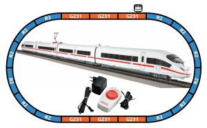 Startovací sada skládající se z čtyřdílné elektrické soupravy německých vysokorychlostních dálkových drah, prodlouženého oválu a analogového ovládání s napájením. Lokomotivu lze dovybavit zvlášť určeným digitálním dekodérem se zvukovým modulem a reproduktorem. U modelu jsou použita nestandardní krátká spřáhla s konektory. Koleje s podložím zajišťují vyšší odolnost a životnost při opakovaném rozebírání. Nákup sady je vhodné doplnit o příslušný spotřební materiál. Plocha základny: 158x88 cmMinimální konstrukční plocha: 168x98 cm Hlavní vlastnosti: analogové ovládáníčtveřice nápravsvětla s přepínáním barvy dle směru jízdyrozhraní NEM 652šachta dle NEM 362 s kinematikou krátkého spřáhlakoleje s podložím Tato sada obsahuje: čtyřdílná elektrická souprava ICE 3 DB AG (1 ks)kolej oblouková R2 s podložím - 55412 (12 ks)kolej rovná G231 s podložím - 55401 (5 ks)kolej rovná G231 s podložím (přípoj pro napájecí svorku) - 55406 (1 ks)podloží pro napájecí svorku - 55447 (1 ks)napájecí svorka ke kolejím analogová - 55270 (1 ks)základní analogový ovladač s napájecím zdrojem - 55003 (1 ks) Dokumentace: Návod k obsluze a seznam náhradních dílů soupravy č. 57196 (DE, EN, F, ITA, E, CHN, NL, POL, RUS, CZ, HUN)