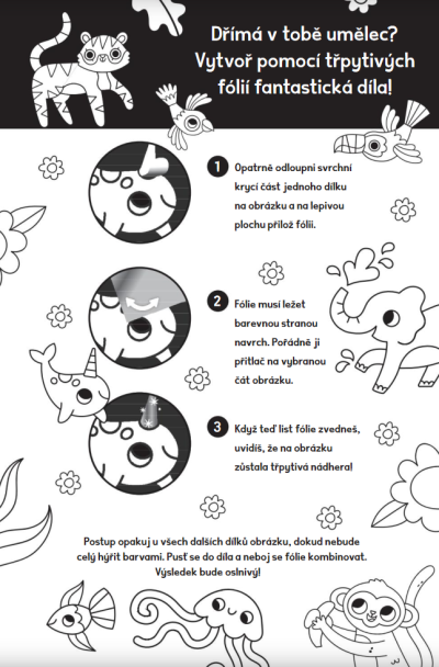 Vytvoř si nádherná zářivá zvířátka všech barev a odstínů. Nepotřebuješ k tomu ani lepidlo! Stačí jen sloupnout nálepku, přitisknout speciální třpytivou fólii, pořádně přitlačit, a duhová zvířátka jsou na světě! A když budeš chtít, najdeš tu i další báječné tvory k vybarvení. Fantazii se meze nekladou! 8 lepicích obrázků, 28 zářivých fólií, zvířátka k vybarvení Pro děti od 3 let. Počet stran: 36 Vazba: Pevná Rok vydání: 2021 ISBN: 978-80-242-7179-8