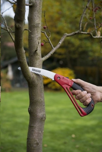 Skládací pilka Kreator KRTGR5001 je skvělým pomocníkem pro rychlé řezání syrového dřeva. 180 mm dlouhá čepel je vyrobena z nerezové oceli a zuby broušené do tří stran značně usnadňují řezání. Ostré zuby jsou navíc pochromované.