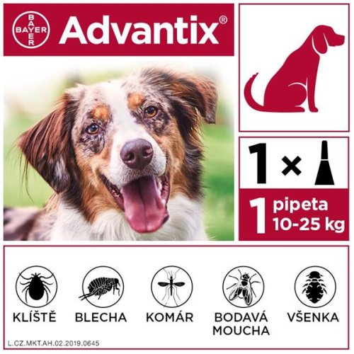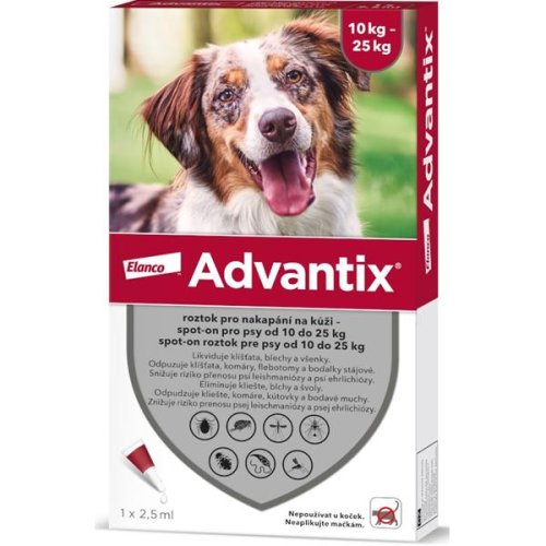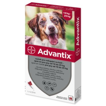 Advantix spot-on od 10kg je vhodný pro plemena psů vážící 10-25 kg (1 pipeta).