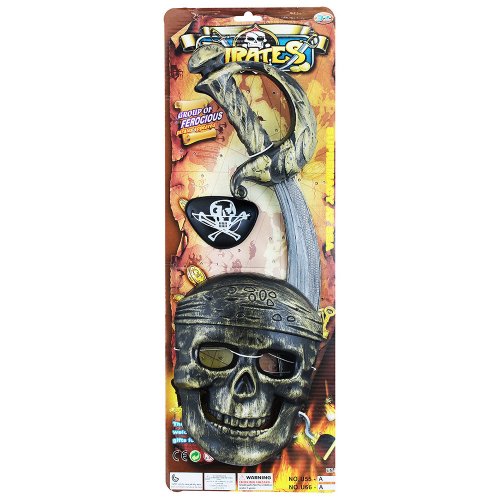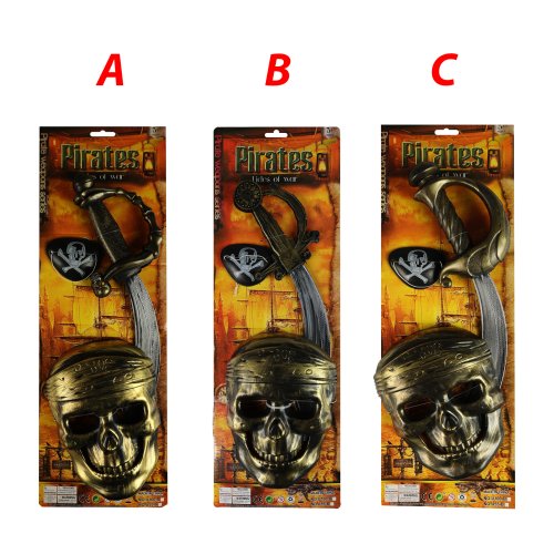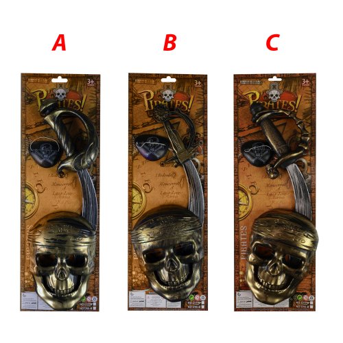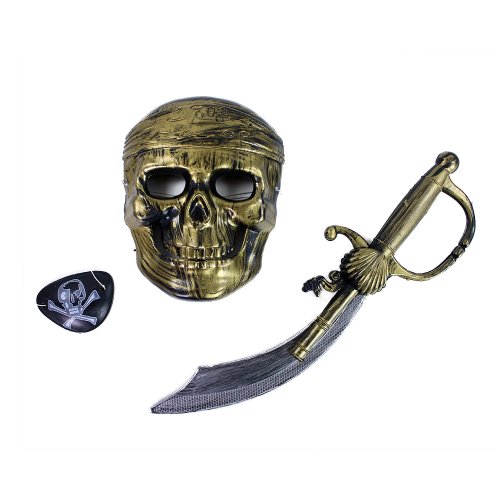 Exkluzivní sada pro všechny malé piráty! Tento parádní set obsahuje bronzovou masku na gumičku, klapku na oko a meč s bronzovou rukojetí. Tyto super doplňky jsou ideální k pirátskému kostýmu! Vše je vyrobeno z PVC.