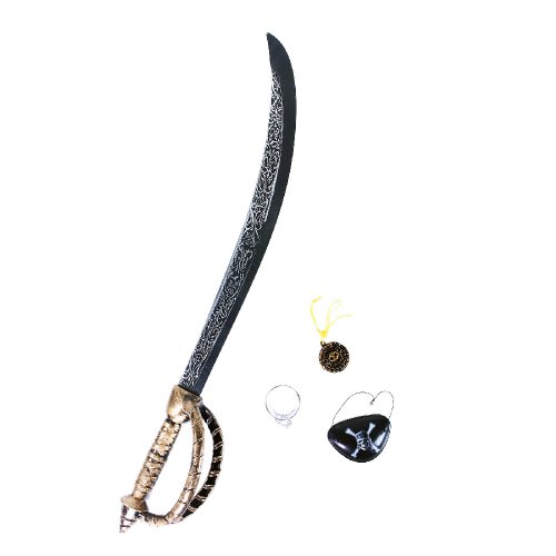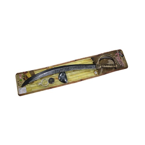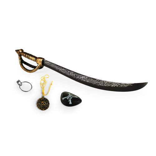Senzační set pro malé piráty! Balení obsahuje vzorovaný meč s úchvatnou rukojetí, pirátskou klapku na oči, náhrdelník s motivem lebky a stříbrný kroužek do ucha.