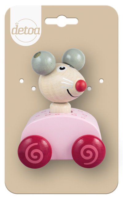Dřevěné pískací zvířátko ve tvaru myšky, po zmáčknutí hlavičky zapiští. Kolečka jsou funkční, v růžovém provedení. Vhodné pro děti od 1 roku.