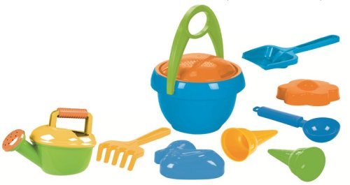 Set na písek obsahuje kyblík o průměru 17 cm, sítko, hrabičky, lopatku, dvě bábovičky, dva zmrzlinové kornoutky, konvičku a zmrzlinovou naběračku. Celkem 10 dílů. Pro kluky od 2 let.