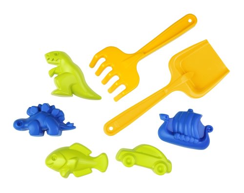 Sada obsahuje 7 dílů pomůcek na písek a to hrábě, lopatku a 5 ks formiček (2x dinosaurus, 1x autíčko, 1x rybka, 1x lodička). Sada je vyrobena z kvalitního materiálu, která je bezpečná pro děti. Je navržena pro děti od 1 roku věku, což zajišťuje bezpečné a zábavné hraní pro nejmenší děti. Podněcuje děti k rozvoji jejich kreativity, zručnosti a také fantazie jak na pískovišti, tak na pláži. Hlavní vlastnosti: vhodné i pro nejmenší 1+pomáhá rozvíjet zručnost a koordinacipodporuje kreativitu a představivostideální na zahradu nebo plážvyrobeno v ČR
