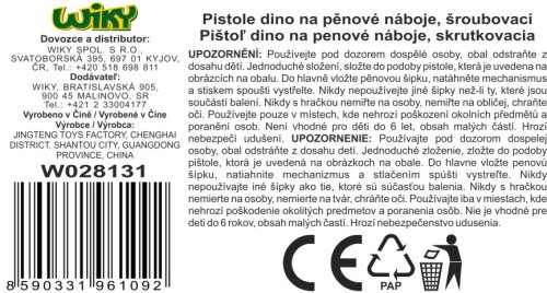 Pistole na pěnové náboje. Šroubovací stavebnice s motivem dinosaurů. Velikost sestavené pistole 21 cm. Balení obsahuje dílky pistole, šroubky, šroubovák, 6 pěnových nábojů. Vystřelovací mechanismus na natažení (ocas).