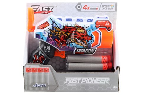 Pistole na pěnové náboje s dračím motivem. Součástí balení 4 náboje. Materiál plast. Baleno v otevřené krabici. Rozměry balení 16x15x5,5 cm. Doporučený věk 8+