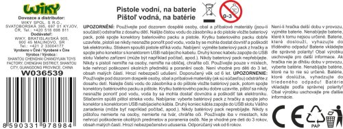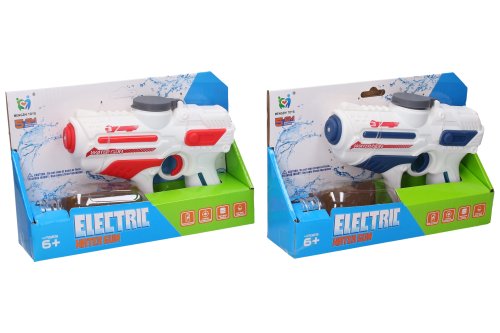 Pistole vodní elektrická. Velikost 18 cm. Zásobník na 200 ml. Dostřel 5 - 8 metrů. 1x3.7V bateriový pack a USB nabíjecí kabel součástí, šroubováček na otevření krytky. 2 varianty - modrá, červená.