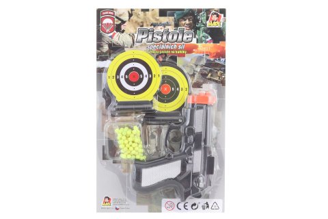 Balení obsahuje pistoli na kuličky o velikosti cca 15 cm,2 terče cca 7,5 cm s podstavcem, a kuličky do pistole.Rozměr balení 17,5 cm x 28 cm.Věk 3+