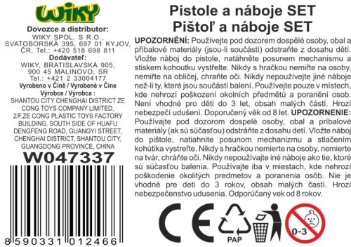 Pistole na pěnové náboje. Velikost 17 cm. Balení obsahuje 5 nábojů. Přesné rozměry pistole 16,8x10,5x4,6 cm. Nabití natažením, jednotlivé střely, výstřel stiskem spoušti.