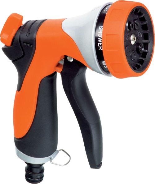 Víceúčelová postřikovací kovová pistole s ergonomickým držadlem, se sedmi druhy nastavení rozstřiku (sprcha, perlátor, mlžítko, proud atd.). S regulací přítoku vody se skvělým designem a funkční zdatností. Baleno v blistru.