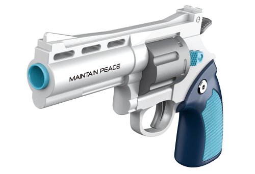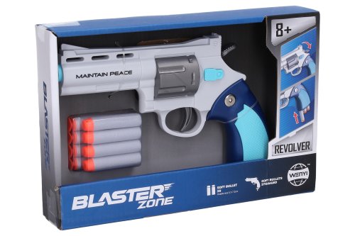 Pistole Revolver s pěnovými náboji. Rozměry 22,5x4,5x15 cm. Součástí 8 pěnových nábojů (4 standardní, 4 s přísavkou). Odkládací plocha pro náboje ze spodní strany rukojeti. Obrázková návod s textem na spodní straně obalu. Střelba vložením náboje do hlavně, natažením kohoutku, stisk spouště.