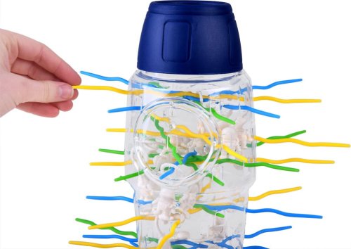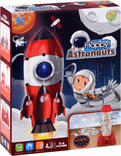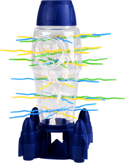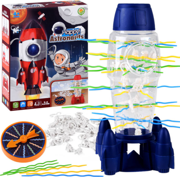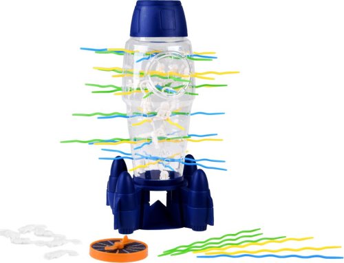 Zábava s astronauty! Hra spočívá v umístění tyčinek do otvorů rakety. Dále nasypete astronauty shora do otvoru rakety tak, aby se o zachytily o tyčinky. Poté hráči postupně točí šipkou na tachometru a podle toho vytahují danou barvu tyčinky z rakety. Musíte dávat pozor, abyste nenechali spadnout astronauta, nejlépe žádného. Ten, komu spadne nejméně astronautů vyhrává. Sada obsahuje: - raketa - 30x figurka astronauta - 30x tyčinka ve třech barvách: žlutá, modrá, zelená - točící tachometr Rozměry: - raketa 27 x 12 x 12 cm - tyče 17 cm - astronaut 4 cm x 1,5 cm x 0,5 cm - tachometr: průměr 6,5 cm Tato hra je určena pro minimálně 2 hráče od 4 let.