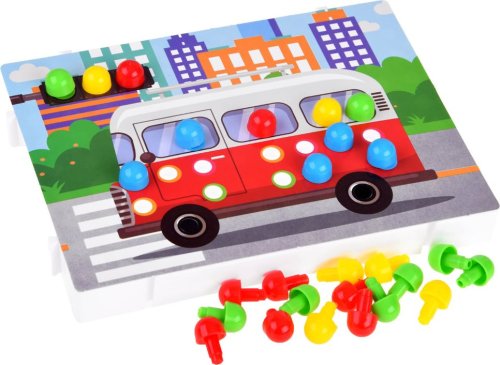 barevné šablony obsahují připravenou předlohu s otvory a úkolem dítěte je vkládat barevné kolíčky ve správné barvě tak, aby vznikl obrázek