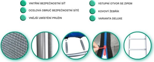 stabilní nohy ve tvaru písmene U odrazová plocha z kvalitního materiálu vnitřní bezpečnostní síť (brání doskoku do části s pružinami) vstupní otvor se zipem ocelová obruč bezpečností sítě elipsovité tyče ochranné sítě s bezpečnostním pěnovým krytem vnější umístění pružin s ochranným krytem kovový žebřík pro domácí venkovní použítí
