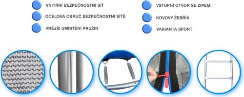 stabilní nohy ve tvaru písmene U odrazová plocha s hladkou povrhovou úpravou a s ochranou proti UV záření je vyrobena ze speciálního polypropylenu vnitřní bezpečnostní síť (brání doskoku do části s pružinami) vstupní otvor se zipem ocelová obruč bezpečností sítě tyče ochranné sítě s bezpečnostním pěnovým krytem vnější umístění pružin s ochranným krytem kovový žebřík pro domácí venkovní použítí