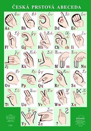 Oboustranná výuková tabule pro nácvik prstové abecedy. Na jedné straně jsou abecedně seřazeny všechny znaky prstové abecedy, doplněné písmeny české abecedy. Druhá strana tabule slouží k procvičování, znaky prstové abecedy jsou uvedeny na přeskáčku, úkolem je dopsat ke znaku správné písmeno české abecedy. 67x96 cm