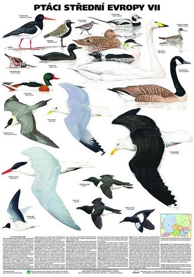 Ilustrátor Pavel Procházka umístil na tabuli 19 mořských ptáků z čeledí kachnovití, slukovití, ústřičníkovití, kulíkovití, chaluhovití, rackovití, rybákovití a alkovití.