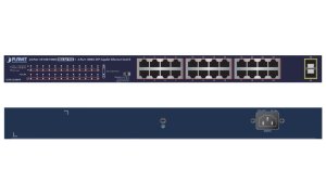 Gigabitový PoE+ přepínač, 24x 10/100/1000Base-T RJ-45 s injektory 802.3af/at, dva SFP sloty 1000Base-X, napájecí výkon až 240 W.