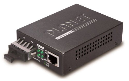 Konvertor pro přechod mezi single-módovým a metalickým spojem pro Gigabitový Ethernet. Spojení pro 5 km až 10 km na straně single-módového vlákna a do 100 m na straně metalického spoje.