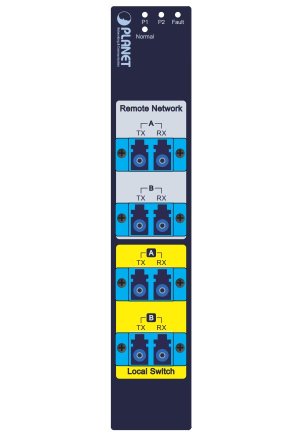 Průmyslový optický bypass přepínač (4 x LC duplex singlemode konektor), který chrání síť před selháním a zajišťuje integritu sítě při výpadku napájení.