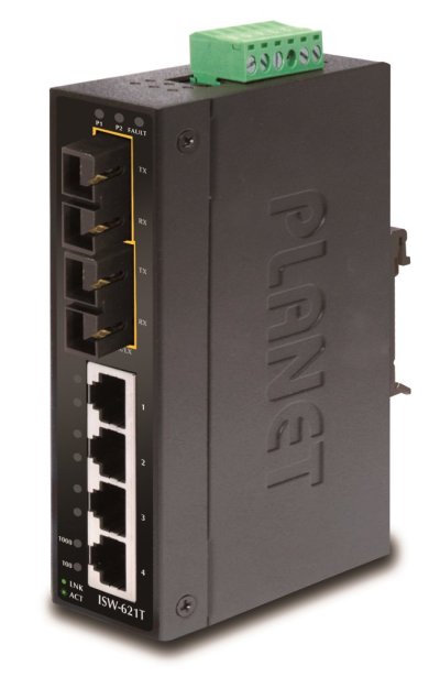 6portový přepínač a konvertor pro průmyslové aplikace. 4 porty 10/100Base-TX, 2 optické porty 100Base-FX, SC konektory, singlemode, dosah 15km.