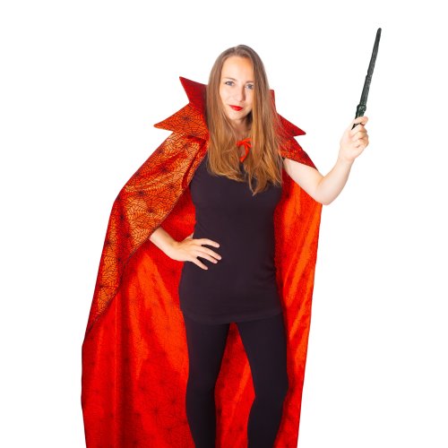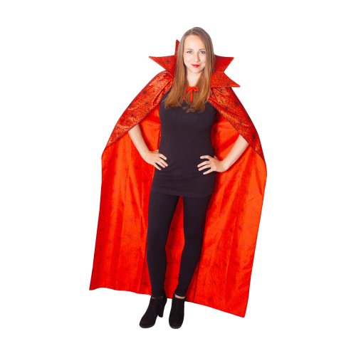 Úchvatný plášť v červené barvě dekorovaný potiskem pavučinky je skvělým doplňkem pro dospělé na Halloween párty nebo karneval.