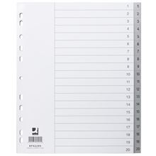 Šedé PP rozlišovače, ideální pro organizaci a kategorizaci dokumentů do pořadačů Sada obsahuje 20 listů (1 - 20) Univerzální multiperforace (11 otvorů) Tloušťka: 120 mikronů Barva: bílá, s šedým okrajem …