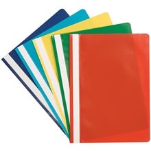 • Plastové rychlovazače naší privátní značky Q-Connect, kvalitní lehké složky pro uspořádání perforovaných dokumentů s průhlednou přední stranou a neprůhlednou barevnou zadní stranou