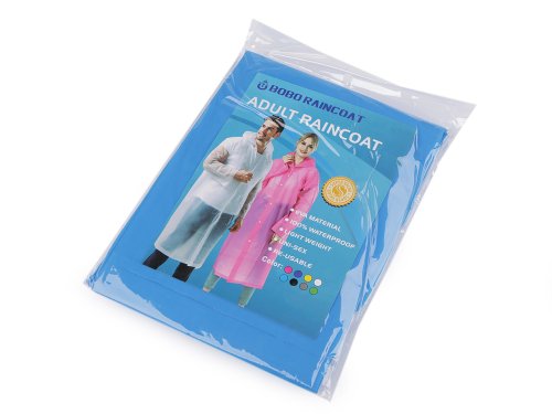 Pláštěnku využijete kdekoli, kde vás přepadne déšť. Je vyrobená z pevného materiálu, kapuce má stahovací šňůrku. Pláštěnka se zapíná na druky, je vložená do plochého sáčku. Pláštěnka měří: zadní délka cca 113 cm, délka rukávu (měřeno od kapuce po konec rukávu) 75 cm, obvod hrudi 130 cm.