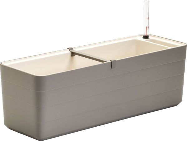 Plastový samozavlažovací truhlík s kontrastním vnitřním dílem s úchyty pro snadnou manipulaci. Součástí je: hladinoměr, svorky, knoty, dostatečně velký zalévací/přepadový otvor. Šířka: 60 cm, výška: 20 cm, hloubka: 20 cm.
