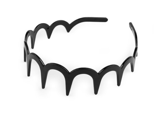 Plastová čelenka s obloučky a velkými zuby má lesklý a hladký povrch. Je vyrobená z kvalitního plastu, velmi dobře ve vlasech drží. Můžete ji využít jako základ k dalšímu dozdobení a vytvořit si tak jedinečný kousek přímo na míru pro vás. Ozdoby můžete nalepovat nejlépe lepidlem na textil nebo tavnou pistolí.