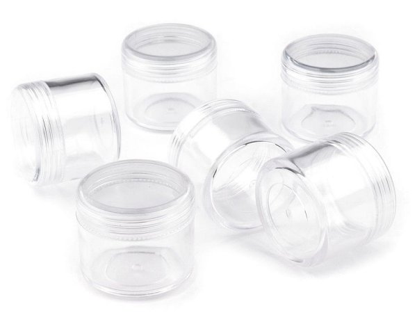 [Plastová dóza je vyrobená z průhledného materiálu. Má šroubovací víko, vložené předměty se nerozsypou. Je vhodná pro praktické uložení rokajlu či jiných korálků, hodí se na flitry, glitry a další drobnosti potřebné nejen pro výrobu bižuterie.] Dóza má objem po okraj [22 ml, těsně pod závit 15 ml.]