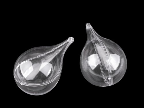 Průhledné plastové objekty se skládají ze dvou dílů, které lze spojit a pomocí očka zavěsit jako dekoraci. Jedná se o polotovar, který je určený k dozdobení např. jej můžete obháčkovat, dekorovat metodou quilling, ubrouskovou technikou, dozdobit glitry atd. Dají se použít i jako dárková krabička. Jelikož se jedná o plast a dodavatel nebalí části odděleně, mohou se na povrchu vyskytovat drobné škrábance.