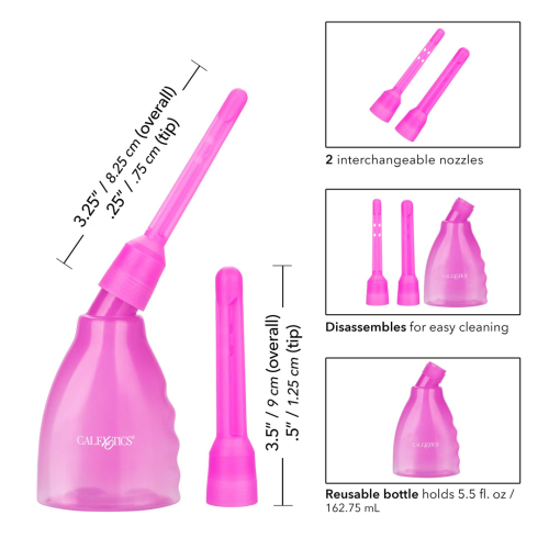 Sada pro očistu análku i vagíny s dvěma nástavci. Nástavce mají otvory ve špičce i na bocích pro dokonalejší očistu. Délka použitelné části nástavců 8,5 cm, šířka 1 cm a 1,5 cm. Objem nádobky 160 ml.