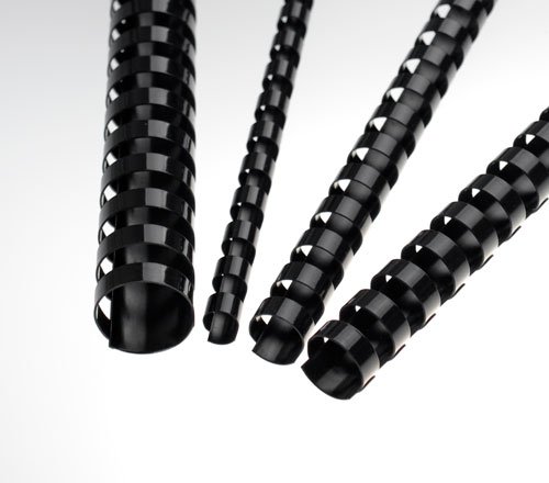 plastový hřbet pro vazbu dokumentů průměr 14 mm kapacita 81 – 100 listů 80 g/m2 formát A4 21 otvorů barva černá balení 100 ks