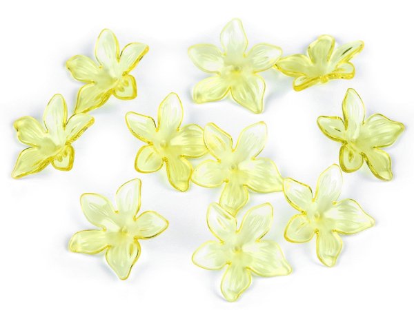 [Půvabný plastový květ v transparentních barvách nadchne především korálkářky, které rády tvoří květinové šperky. Je velice lehký, vhodný i na náušnice. Květ můžete využít jako sukýnku k výrobě ketlovaných andělíčků, viz naše ilustrační foto. Na našem specializovaném webu najdete detailní fotonávod na výrobu andělíčků.]