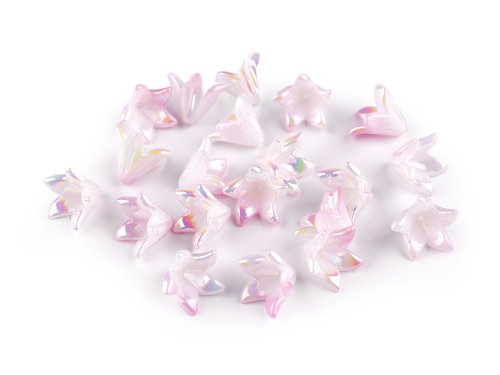Plastové korálky květů ve tvaru zvonku nadchnou děti i dospělé. Jsou doslova magické, protože mají vysoký perleťový lesk s AB efektem. Ocení je korálkářky, které rády tvoří květinové šperky nebo malé andělíčky. Korálky můžete použít na výrobu náhrdelníků, přívěsků ke klíčům, jako sukýnku na korálkové andělíčky, hodí se i k ozdobení tašek apod. Jejich velikou výhodou je nízká hmotnost.
