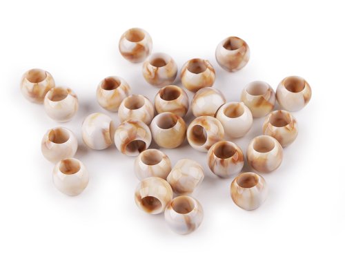 Žíhané plastové korálky s velkým průvlekem jsou zajímavé svým probarvením imitujícím mramor, kdy každý korálek je jiný. Jemně se lesknou, jsou velice příjemné na pohled, působí přírodním dojmem. Jsou velice kvalitní, všude hladké, nemají žádné otřepení nebo viditelné švy. Využijete je na výrobu bižuterie i různých dekorací, např. lapačů snů. Skvěle se kombinují s dalšími korálky různých tvarů a materiálů. Korálky využijete i ke zdobení oděvů, tašek nebo plavek. Korálky jsou vhodné pouze pro šetrné ruční praní. Balení 20 g obsahuje cca 35 ks korálků.
