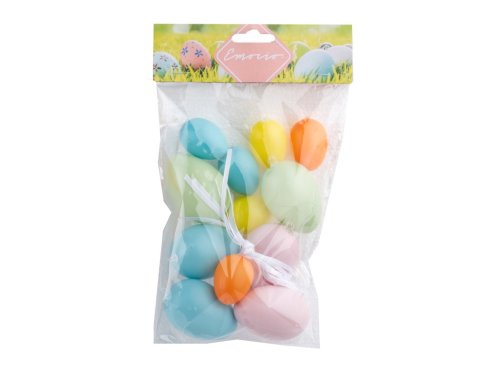 Sada 12 plastových kraslic v kombinaci velikostí 40 mm a 60 mm, dodávaná v barevném mixu. Kraslice jsou baleny v sáčku a jednotlivé kusy se mohou lišit odstínem nebo velikostí.