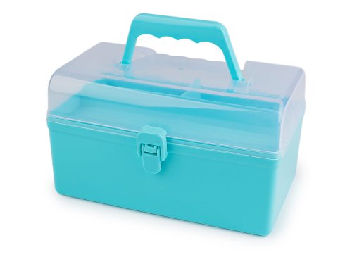 Průhledný zásobník s odnímatelným patrem je praktický pomocník při skladování komponentů a nářadí pro kreativní tvorbu. Má jednoduché pákové uzavírání a rukojeť na pohodlné přenášení. Je vhodný i pro švadleny, které ocení, že je dovnitř vidět. Odnímatelné patro na drobnosti má mělké přihrádky - jednu dlouhou a 2 malé, hluboké 1,5 - 2,5 cm. V dolním patře je prostor o rozměrech cca 12 x 20,5 x 6,5 cm.