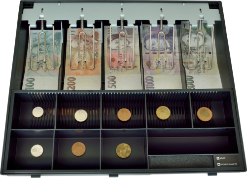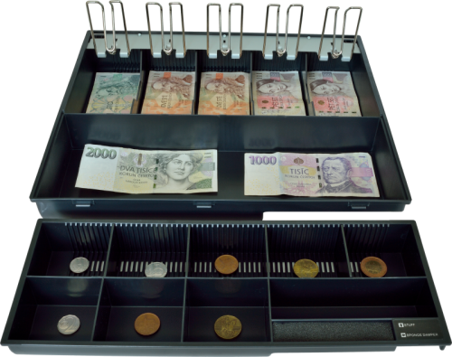 Dostatečně široký pořadač pro pohodlné umístění 5 druhů bankovek vedle sebe. Obsahuje vyjímatelný mincovník a pořadač bankovek s libovolně nastavitelnými přihrádkami. Pořadač disponuje kovovými držáky bankovek a je možné jej doplnit o uzamykatelný kryt EPP12050.